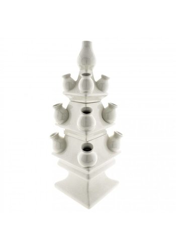 Een bloempiramide wordt deze witte tulpenvaas ook wel genoemd. Deze vaas bestaat uit 3 delen waardoor er steeds een compartiment voor water is. 40 cm hoog.
