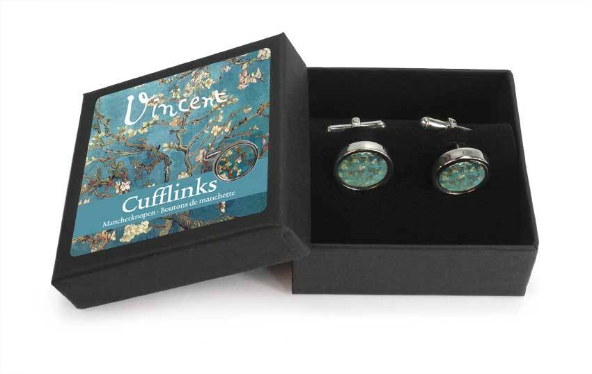 Prachtige, roestvrijstalen manchetknopen met van Gogh "Amandelbloesem" design. De manchetknopen zijn verpakt in een luxe giftbox.