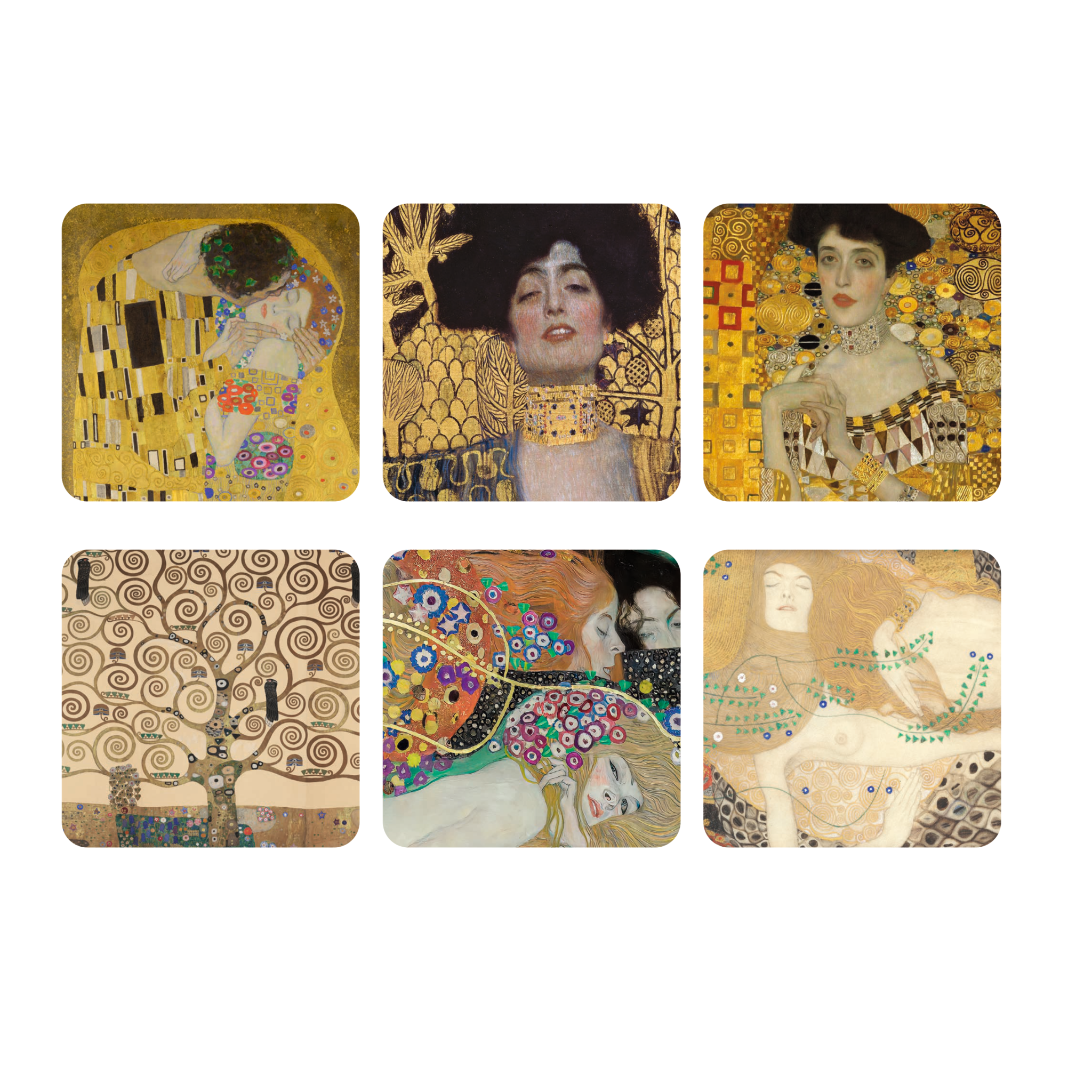 Set van 6 onderzetters van Meesterwerken van Gustav Klimt. Gemakkelijk schoon te maken, onderzetters met een kurklaag aan de onderzijde, hittebestendig laminaat oppervlak, in een doorzichtige verpakking